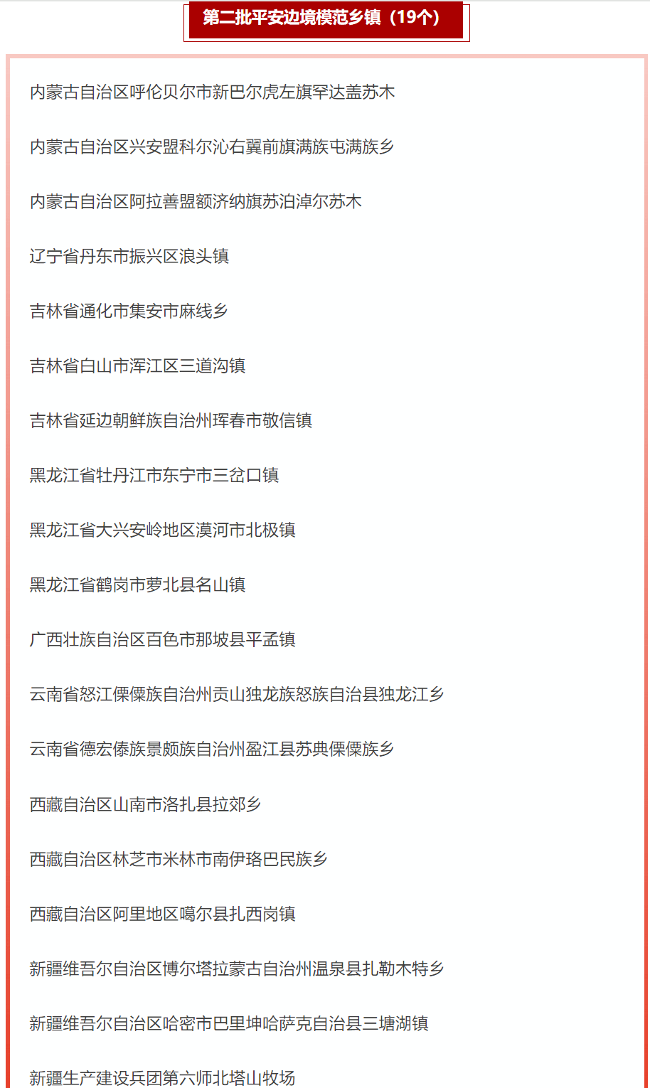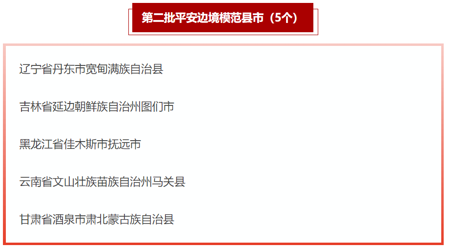 5个第二批平安边境模范(fan)县(xian)市名单。(国家移民管理局微信公众号截图)