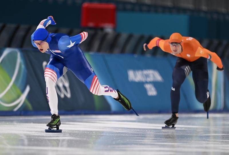2月11日,美国选手斯托尔(er)兹(zi)(左)正在比赛中。当日,米兰-科尔(er)蒂纳冬奥会速度溜冰男(nan)子1000米决赛正在乎(hu)大利米兰举行。新华社