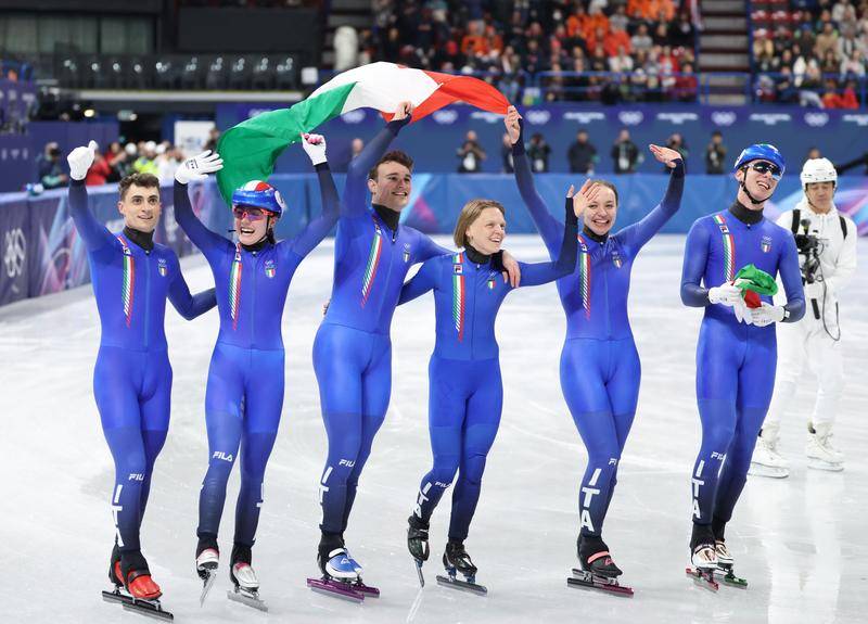 2月10日,意大利队选手庆贺夺冠(guan)。当日,米兰-科尔(er)蒂纳冬奥会短道速滑混合团(tuan)体接(jie)力决赛正在乎(hu)大利米兰举行,意大利队获得冠(guan)军。