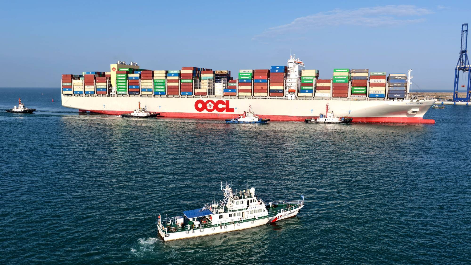 大型集(ji)装(zhuang)箱船舶(bo)驶进洋浦港(央广网发 洋浦海事局供图)