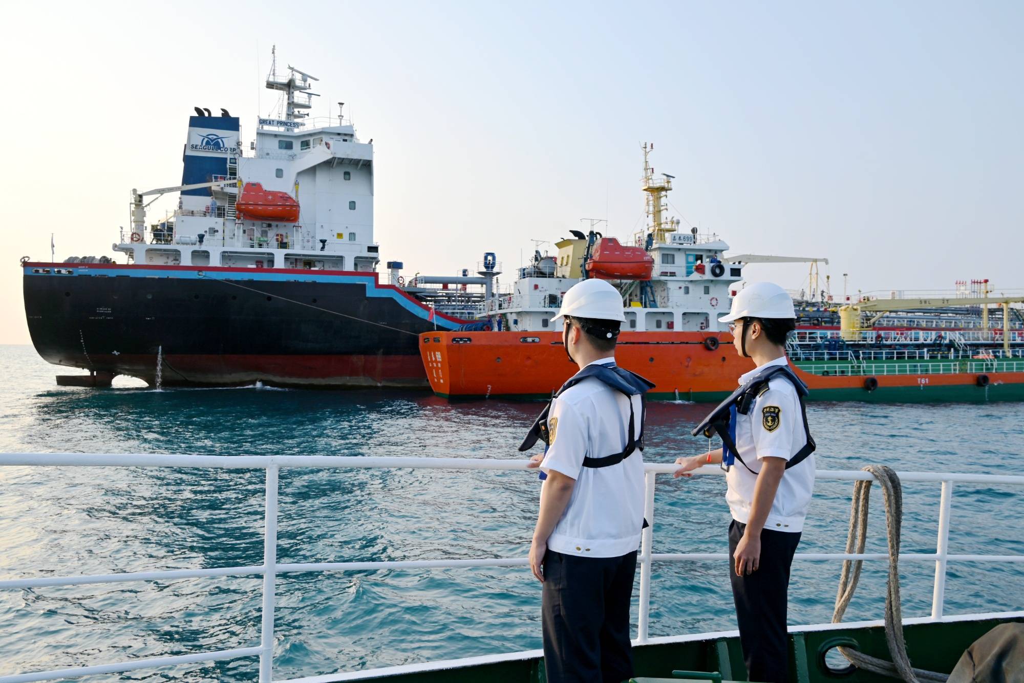 3月18日,“嘉泰699”正在洋浦1号外锚地为外籍船“GREAT PRICESS”完成加注燃(ran)料油(央广网发 洋浦海事局供图)