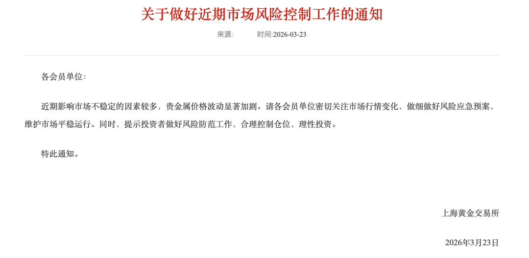 3月23日,上(shang)海黄金生意业务所公布《关于(yu)做好近期市场风险控制(zhi)工(gong)作的通知》称,近期贵金属代价颠簸明显加剧,请各会员单位密切关注市场行情变更(geng),做细做好风险应急预案,维护市场平稳运行。同时,提示投资者做好风险防范(fan)工(gong)作,合理(li)控制(zhi)仓位,理(li)性投资。