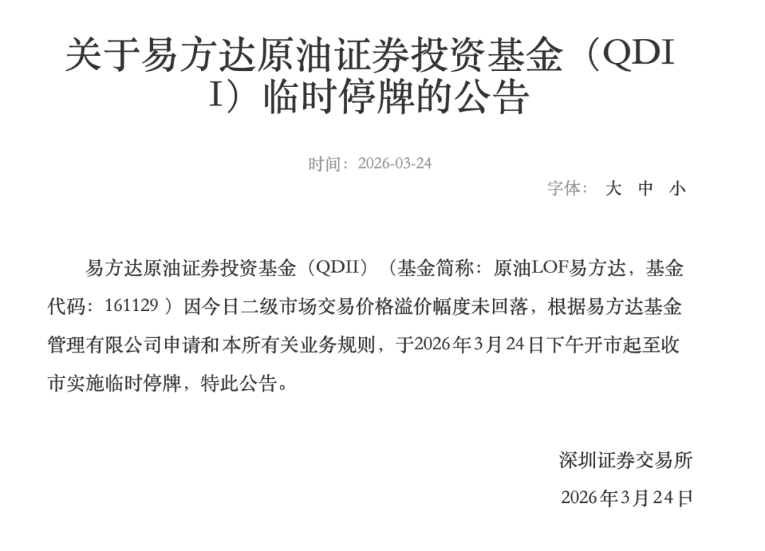 富国基金与嘉实基金旗下的标普油气ETF也发布了类似停牌安排。富国基金表示,因该基金二级市(shi)场交易价格明显高于基金份额参考净值(IOPV),出现较大幅(fu)度溢价。特(te)此(ci)提示投资者关(guan)注二级市(shi)场交易价格溢价风险。为保护投资者的利益,本(ben)基金于3月(yue)24日开(kai)市(shi)起至(zhi)当日10:30停牌。嘉实基金公告表示,嘉实基金旗下的标普油气ETF嘉实于3月(yue)24日开(kai)市(shi)起至(zhi)当日10:30停牌,自3月(yue)24日10:30复牌。