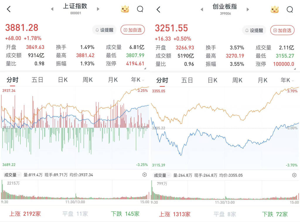 至开盘,上证综指涨1.78%,报3881.28点;科创50指数涨2.33%,报1290.79点;深证成指涨1.43%,报13536.56点;创业板指涨0.5%,报3251.55点。