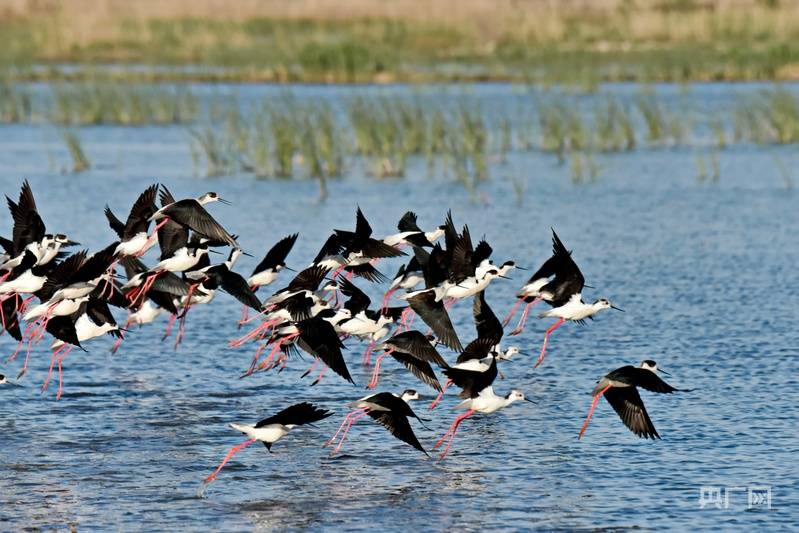 长脚鹬掠过白洋淀水面(央广网发 周龙山(shan) 摄)