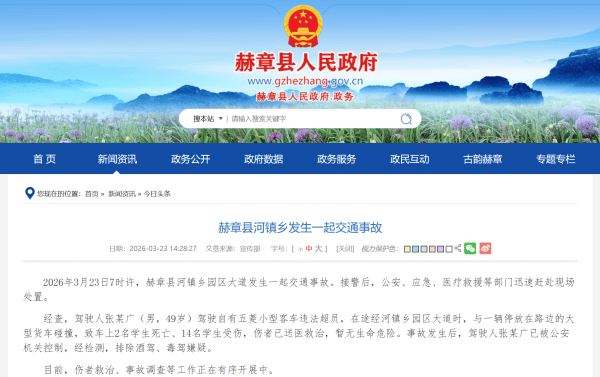 贵(gui)州赫章县人民当局网站转达,2026年3月23日(ri)7时许,赫章县河镇乡园区大道产生一路交通事故。接警后,公(gong)安、应(ying)急、医疗救(jiu)援等部门迅速赶赴现场处置(zhi)。