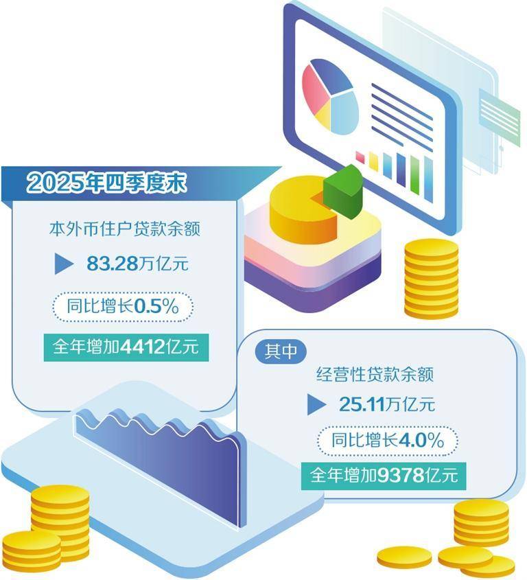 近年来,银行(xing)加大经营性贷款供给,满足实体(ti)企业在生(sheng)产经营活(huo)动中的短期或中期资金(jin)需(xu)求。数据显示(shi),2025年四季度末,本外币住户贷款余额83.28万(wan)亿元,同比增长0.5%,全(quan)年增加4412亿元。其中,经营性贷款余额25.11万(wan)亿元,同比增长4.0%,全(quan)年增加9378亿元。