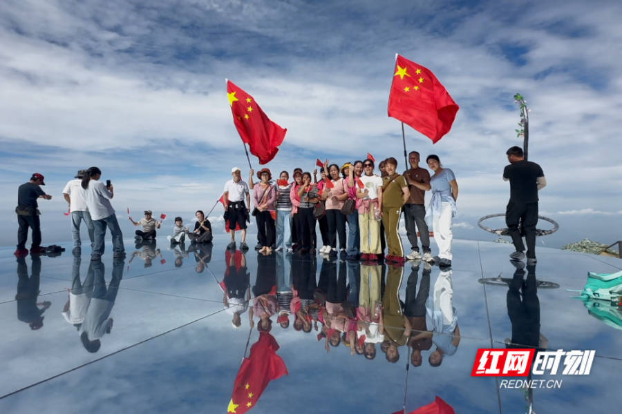 红网时刻新闻10月3日讯(记者(zhe)龚子杰 陈(chen)雅如)国庆中秋(qiu)长假期间,10月2日,在(zai)岳阳平(ping)江(jiang)幕阜山国家(jia)森林公园,多名游客登临海拔(ba)1596米的(de)“天空(kong)之(zhi)镜(jing)”观景台,挥舞(wu)起五星红旗(qi)。旗(qi)帜在(zai)蓝(lan)天与镜(jing)面之(zhi)间猎猎飞扬,赤色的(de)倒影与壮丽河山交相辉映,构成一幅动(dong)人的(de)画面。