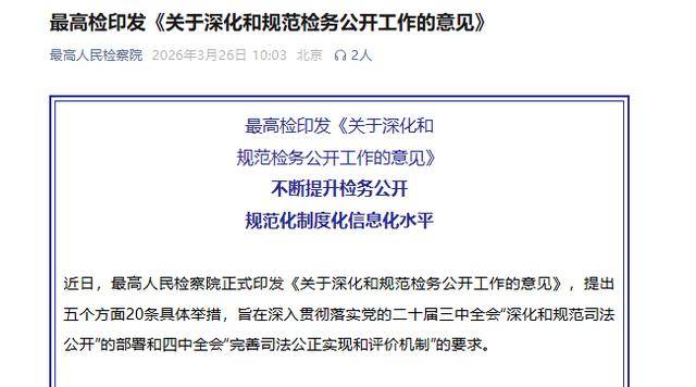 近日,最高人民检察院正式印发《关于深化和规范检务公(gong)然工作的看法》,提出五个方面20条具体举措,旨在深入贯彻落实党的二(er)十届三中全会“深化和规范司法公(gong)然”的部署和四(si)中全会“美(mei)满司法公(gong)正实现和评价机制”的要求。
