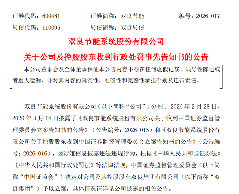 3月23日(ri),“蹭热点”被罚的企业(ye)再添一(yi)例——双(shuang)良节能。该公(gong)司发布公(gong)告(gao)称,2026年3月22日(ri)收到中(zhong)国(guo)证监会江苏(su)监管局(ju)下发的《行政处罚事先(xian)告(gao)知书(shu)》。 因蹭“Space X”热点,双(shuang)良节能、公(gong)司相干义务人以及控股股东双(shuang)良集团被合计罚款1300万元。