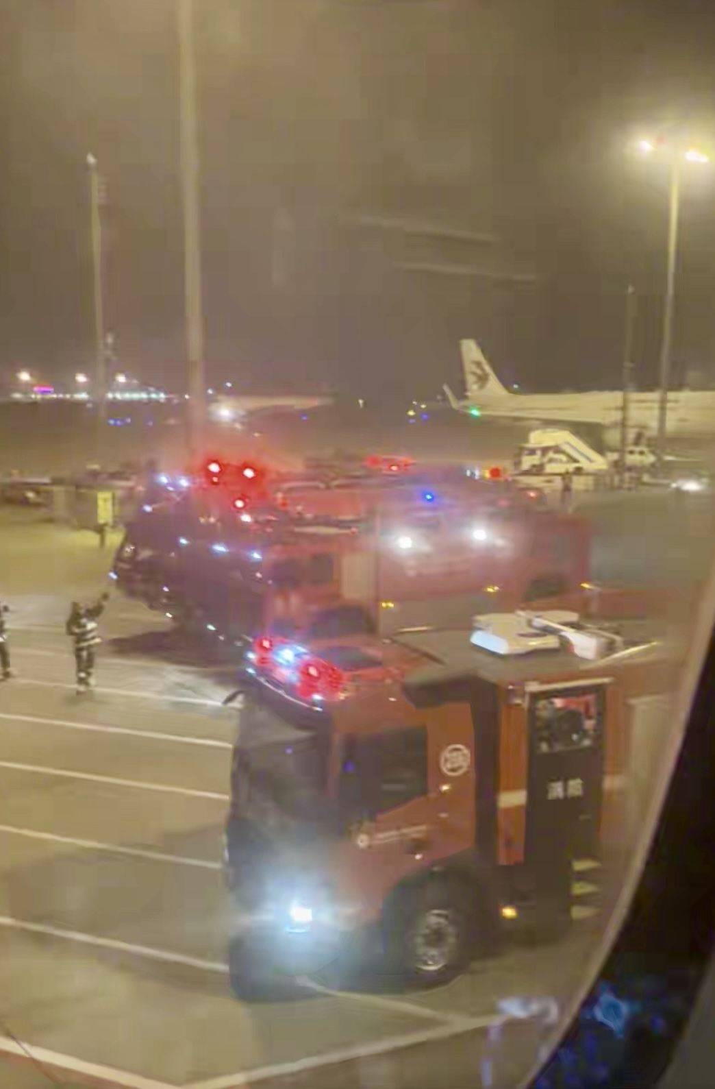 3月22日晚(wan),MU5128次航班落地上海后多辆机场消防车出动。受访者供图