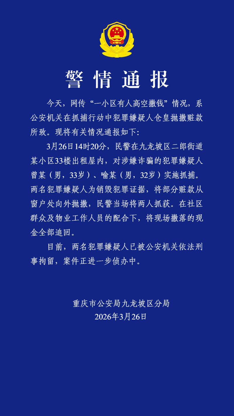 3月26日晚,重(zhong)庆市公(gong)安局九(jiu)龙坡区分局就“有人高空撒(sa)钱”一事发布通报。