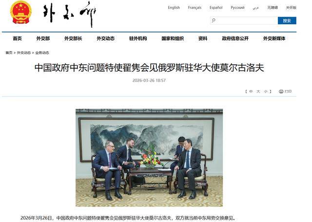 2026年3月26日,我(wo)国当局中东问题特使(shi)翟隽访(fang)问俄(e)罗斯(si)驻华(hua)大使(shi)莫尔古洛夫(fu),双方(fang)就以后中东事态互换意见。