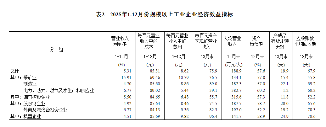2025年末,范围以上产(chan)业企业每百元资产(chan)实现的营业收入为75.9元,比上年末减少2.7元;人均营业收入为188.9万元,比上年末增加5.5万元;产(chan)成品存货周转天数为19.9天,比上年末增加0.6天;应收账(zhang)款均匀回收期为67.9天,比上年末增加3.6天。