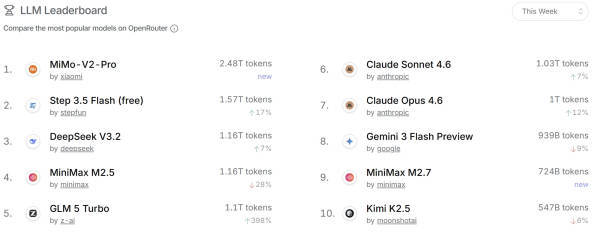 OpenRouter的排行榜(bang)依据真实(shi)用户的“词元”(Token)调(diao)用量统计,截至25日,本(ben)周大语言模型热门榜(bang)单前十中,中国模型占据七席,小米19日发布的 MiMo-V2-Pro暂列首位。
