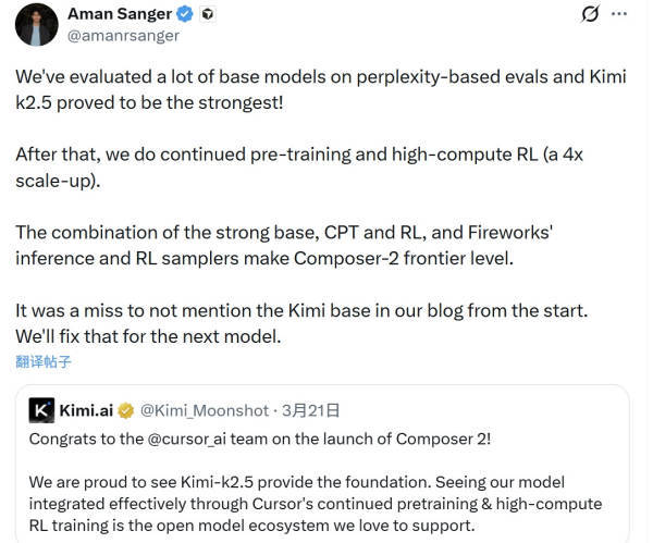 阿曼·桑格公开承认(ren),新代码模型Composer 2基于月(yue)之暗面的开源模型Kimi K2.5开发