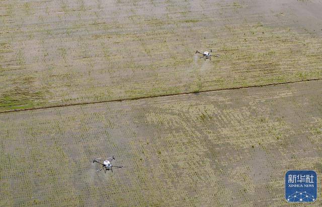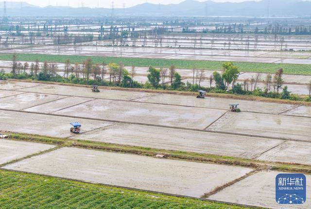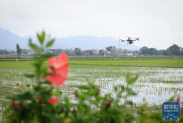 ↑ 3月24日,在广(guang)东江(jiang)门台(tai)山市都斛镇,农业无人机在插好秧苗的田间(jian)作业。