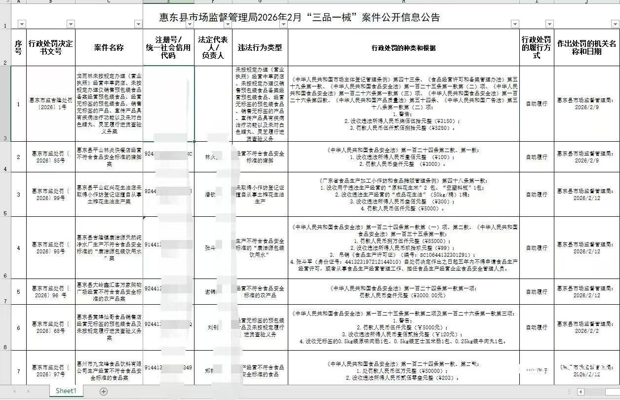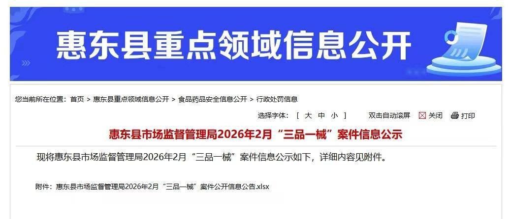 日前,惠东县重点范畴(chou)信息公开平台对惠东县市场监视管理局2026年(nian)2月“三品(pin)一械”(食物(wu)、药品(pin)、化妆品(pin)、医疗器械)案件信息予以公示(shi),共触(chu)及18起案件,涵盖了无证经营、生(sheng)产经营没有切合安全标准食物(wu)、标签违规、利用过期(qi)质料、化妆品(pin)标签成绩等多种违法行为。