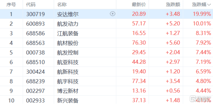商业航天、航空装备板块强势,安达维尔、航发动(dong)力涨停,江航装备、航材股(gu)份、航发控制等多股(gu)跟涨。