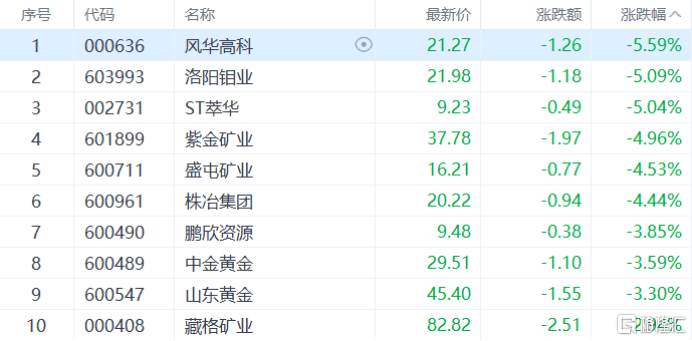 小金属、贵金属等板块弱势,风华高科、洛阳(yang)钼业、ST萃华跌超5%,紫金矿业、盛屯矿业、株冶团体等多股(gu)跟跌。