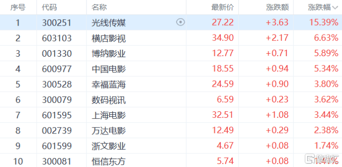 影视院线拉升(sheng),光芒传媒涨超15%,横店影视、博纳影业、我国电影等多股(gu)跟涨。