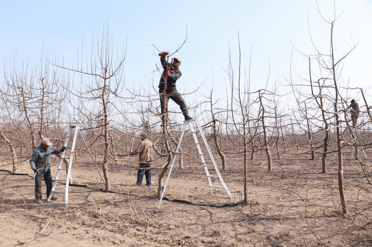 工人们手(shou)持短锯、电动修枝剪,迷信修剪促丰登(梅英 摄(she))